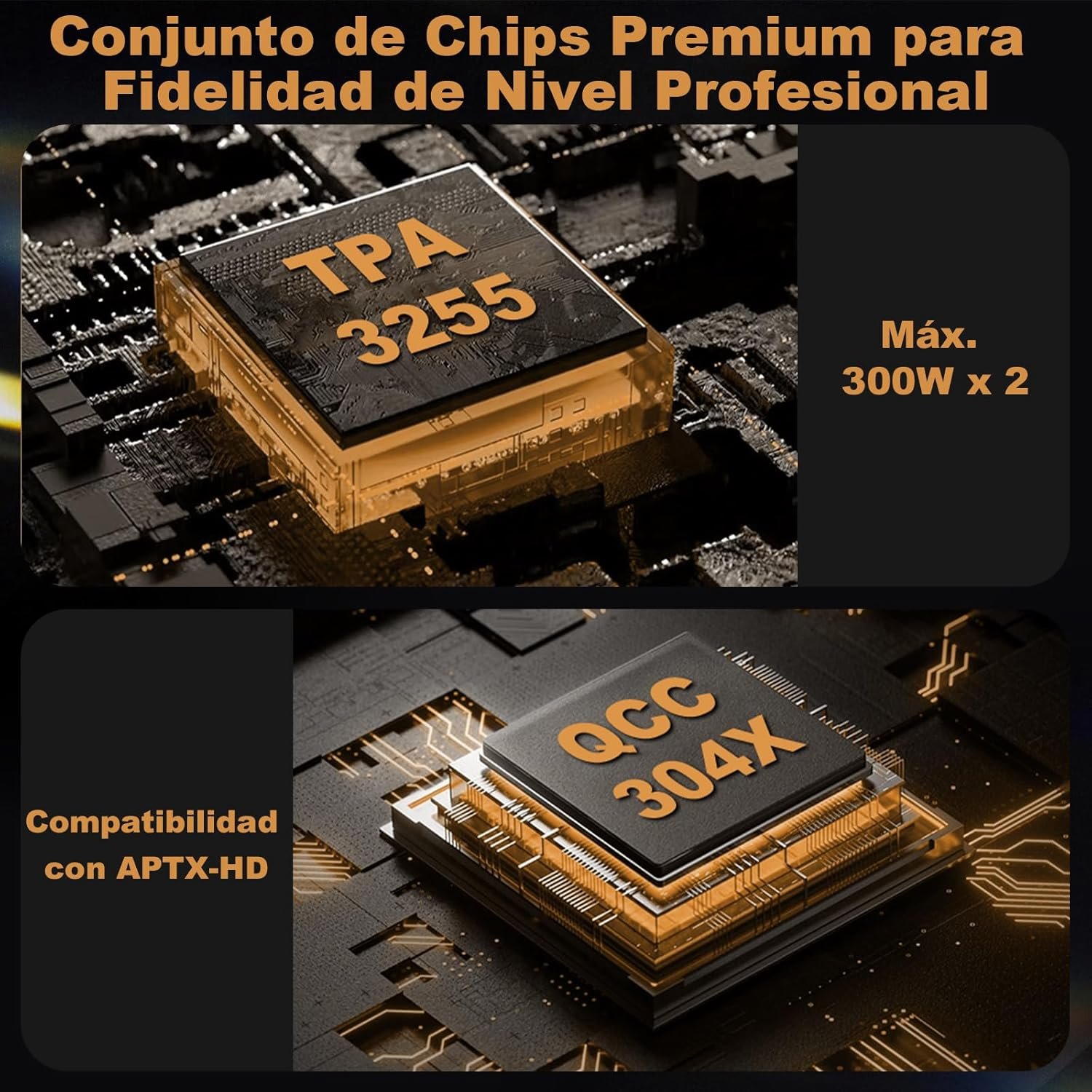 - Amplificador de chip TPA3255 TI con salida de potencia de 300 vatios x 2: Diseño de retroalimentación avanzado y corrección de errores del controlador de puerta de alta velocidad para un rendimiento de audio eficiente y de alta calidad, con bajas pérdidas en ralentí de <2,5 W.