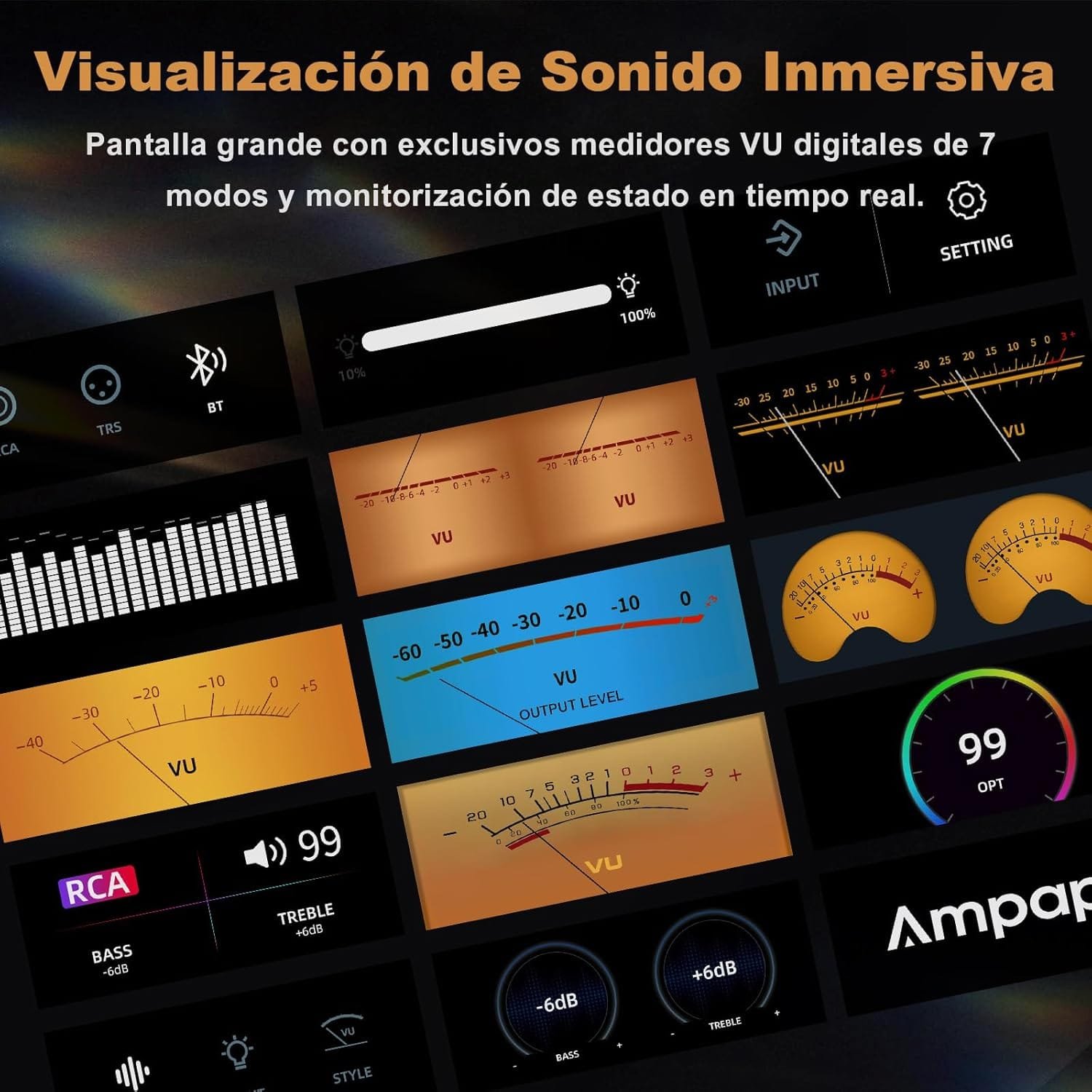 - Panel visual : el medidor VU combina un atractivo estético con características funcionales únicas. El puntero del medidor oscila dinámicamente con los cambios en la señal de audio, lo que le ayuda a ajustar el volumen del audio en tiempo real para evitar sobrecargas y distorsiones.