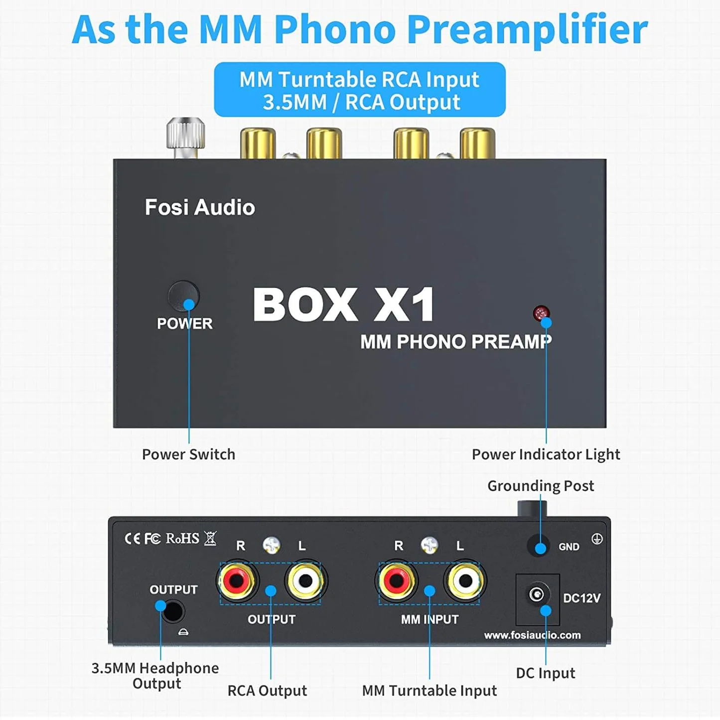 Fosi Audio BOX X1-MM Phono Preamp MM Turntable Pream3.5 mmer With 3.5mm AUX Headphone Output: